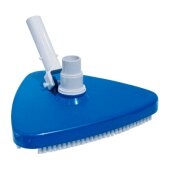 Triangle vacuum head, weighted, with multiple brushes. Heavy duty. Recommended for concrtete and in-ground vinyl pools, and pools with delicate tiles or mosaรฏcs. Model K052 for use with telescopic pole and flexible vacuum hose. For more details: https://www.poolmaster.asia/product/triangle-vacuum-head-with-brushes-heavy-duty/