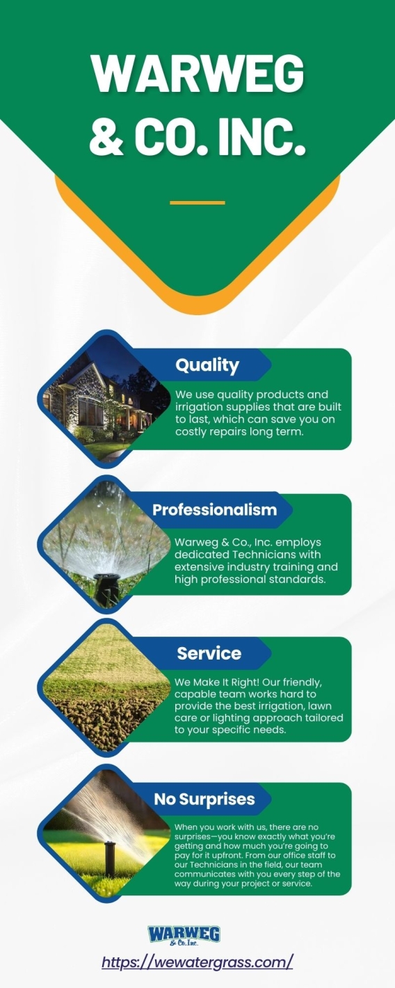 Warweg & Co., Inc. is a family-owned and operated sprinkler, Lawn Care, & Lighting company that specializes in sprinkler repair, sprinkler maintenance and sprinkler installation. Since 1990, we have assisted numerous homeowners throughout the greater-Indianapolis area with sprinkler solutions. When you need to go beyond the usual maintenance services, Warweg & Co., Inc. accomplishes more for less every day. We stand behind our work and ensure your satisfaction. Contact us today at...